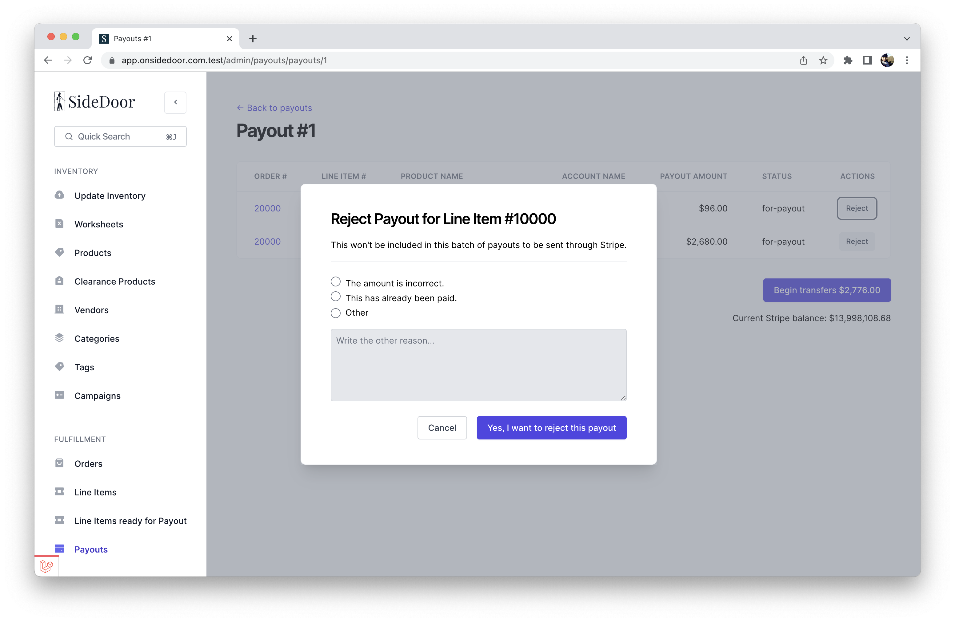 Furthermore, the finance head has the ability to reject a payout and remove the item from the processing queue.